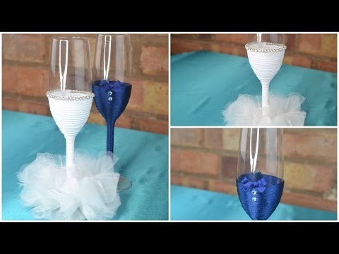 Toasting Glasses for wedding: DIY Tutorial - How Much Glassware For Wedding - DIY tutorial on unique bride and groom toasting glasses for wedding. Items used: *Champagne flutes *Ribbon knot cord *Diamante beads *Ribbon bow *2 ...